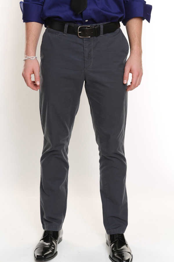 Straight leg chino. Back pockets with button closure. 14" leg opening. Zip fly. 100% cotton.