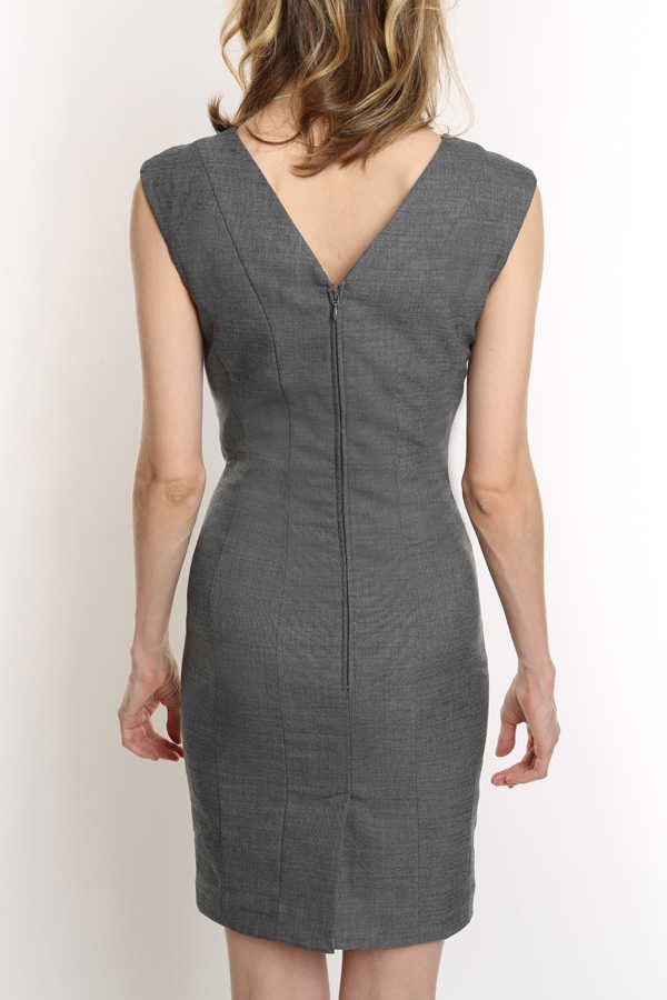 Sleeveless, jewel neckline with deep Vee in back. Fitted through waist and hip. 100% polyester lining. Cotton/wool. Dry clean.