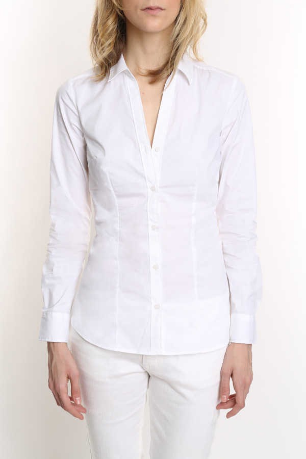 Oxford, fitted through the waist. V-neck, front button closure.100% cotton. Machine wash.